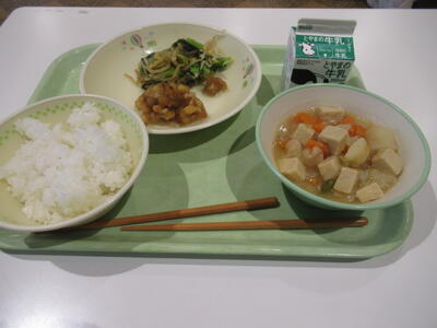 本日のメニューは、 ごはん、牛乳、コーン入りおひたし、たらビーンズ、高野豆腐の含め煮です。