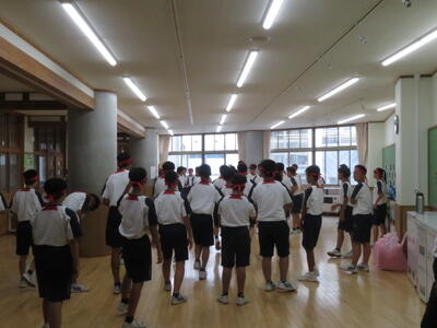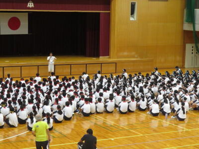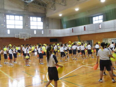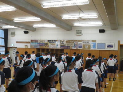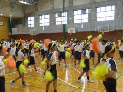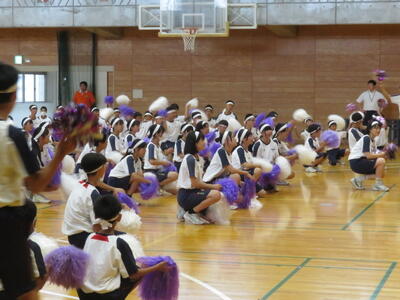 活動の前に先生から明日の体育大会に向けて、中心となって頑張ってきた3年生への労いと、明日は全校生徒が心を一つにして素晴らしい体育大会にしてほしいという話がありました。練習では上手くいかなかったこと、苦労したことがたくさんあったと思います。色々な事を乗り越え、明日は生徒達ではなく、観ている人たちも感動する素晴らしい体育大会にきっとなると思います。あいにくの雨の為、室内での練習となりましたが、どの団も「団員が心をひとつ」にして、最後の練習に精一杯取り組みました。