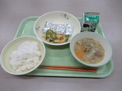 本日のメニューは、 ごはん、牛乳、さばの銀紙焼き、梅肉和え、鶏団子汁 です。