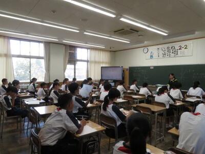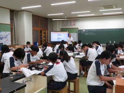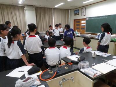 「身のまわりの気体には、どのような性質があるのだろうか」という課題に取り組んでいました。様々な気体に火を付け、どのような反応があるかを調べる実験です。今回は先生が手早く実験を進め、生徒達は真剣に観察をしていました。