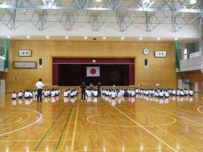 体育館では、2学年が体育大会の練習を行いました。100mの走順を確認した後で、学年競技の騎馬戦の練習しました。