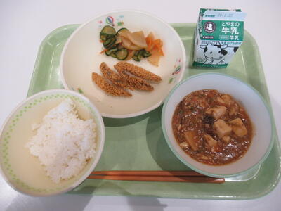 本日のメニューは、牛乳、ごはん、麻婆豆腐、きびなごのカリカリフライ、大根サラダです。