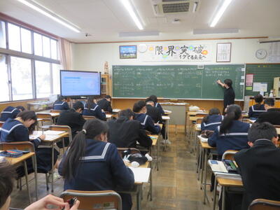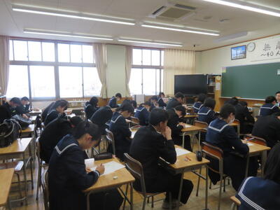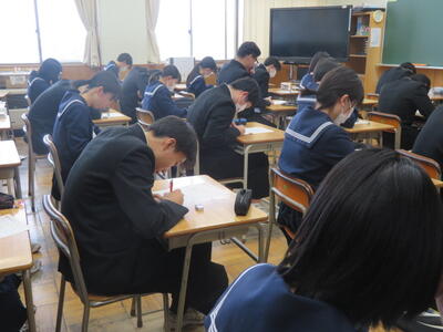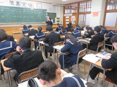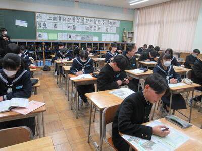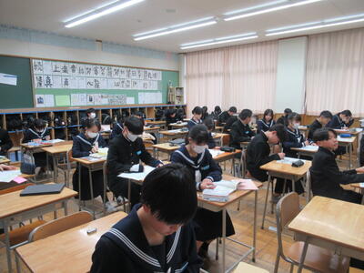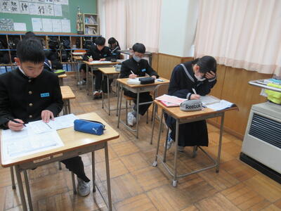 入試に向けてまとめのプリントに取り組んでいました。集中して取り組んでいました。3年生は今週の木曜日に到達度確認テスト(5教科)があります。日頃の頑張りが発揮できるといいですね。