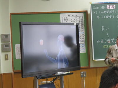 「ヒトの感覚器官と5つの感覚」という課題を学習していました。”りんごを掴む”という動作では、どのような感覚が働き、動作につながっているかを動画で確認していました。説明文だけを読むより、理解しやすくなりますね。