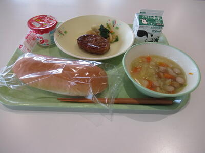本日のメニューは、牛乳、コッペパン、ポトフ、ハンバーグケチャップソースがけ、かぶのサラダ、ヨーグルトです。