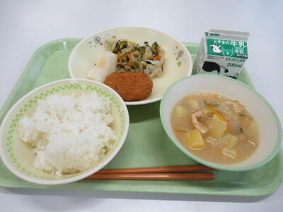 本日(8/27)の給食献立は、ごはん、牛乳、メンチカツ、ひじき和え、みそ汁、幸水なし です。