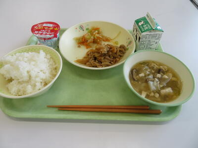 本日のメニューは、ごはん、牛乳、豚肉のスタミナ炒め、キャベツひたし、けんちん汁、ヨーグルト です。
