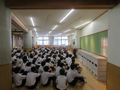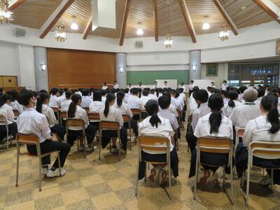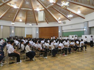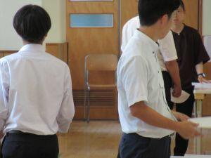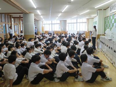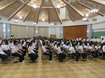 終業式後、各学年で学年集会が行われました。1学期の振り返りや、夏休みの過ごし方、2学期に向けて頑張ってほしいこと等たくさんの話がありました。各学年で話の聞き方は異なりましたが(黙って聞いている姿、先生の言葉に反応してつぶやきながら聞く姿など)、どの学年も確かに話を自分のこととして受け止め、この後に生かそうとしている姿が見て取れました。生徒と先生の人間関係は1学期の間で着実に築かれていると思いました。
