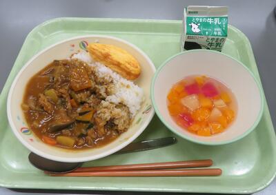 本日のメニューは、夏野菜カレー(カレールウ・ごはん)、牛乳、オムレツ、フルーツポンチ です。