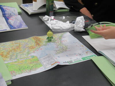 地図と人形、透明下敷き、シェービングフォームを用い、温帯低気圧が通過したときの気象の変化を空間的に捉えられるようにと工夫された授業でした。生徒たちは、モデルを動かしながら、気象の変化を説明していました。その後、透明下敷きの上に、積乱雲と乱層雲をシェービングフォームでつくりました。これにより、それぞれの雲の下での雨の降り方もイメージしやすいようでした。
