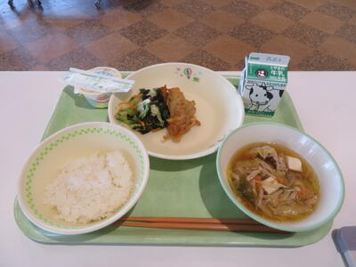 本日のメニューは、ごはん、わかめサラダ、魚の天ぷら、肉豆腐、牛乳プリン、牛乳です。デザートがつく日は、幸せな気持ちになりますね。