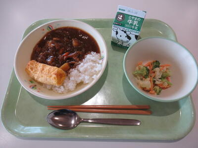 1/21(水)今日の給食献立 投稿: 雄山01 (09:36) 本日のメニューは、牛乳、ハヤシライス、卵ロール、フレンチサラダです。 3つの学級しか見ていませんが、どの学級も食缶が空っぽでした。 ハヤシライスもサラダも学級みんなで平らげたのでしょう。 よく食べることで元気になるということがあります。 すべての雄中生が風邪などひかずに元気に過ごしてほしいです。