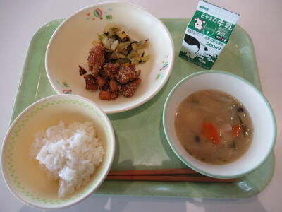 本日のメニューは、牛乳、ごはん、団子汁、鶏肉とじゃがいものごまからめ、ひじき和えです。