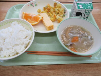 本日のメニューは、牛乳、ごはん、野菜たっぷり汁、厚焼き玉子、カレーミックスポテト、デコポン です。