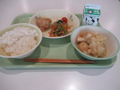 本日のメニューは、 ごはん、牛乳、鶏肉のから揚げ、のり和え、大根の煮物、ミニトマト です。