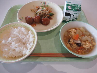 本日のメニューは、牛乳、ごはん、高野豆腐の卵とじ、肉団子の甘酢あんかけ、炒り大豆和え です。