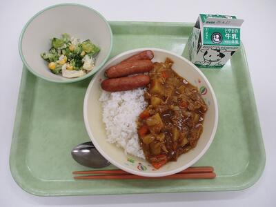 本日のメニューは、牛乳、カレーライス、ウィンナー、花野菜サラダ です。