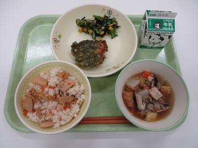 本日のメニューは、牛乳、たけのこごはん、けんちん汁、豚肉の磯部揚げ、ひじき和え です。